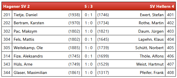 Die Reserve des Hagener SV war an fast allen Brettern deutlich besetzt. Über den Favoriten in diesem Match musste also nicht diskutiert werden. Über Fairness auch nicht, denn die Hagener verzichteten am ersten Brett auf einen pünktlichen Partiestart. Stefan Ewert hatte eine viertelstündige Verspätung angekündigt und die Uhr wurde angestellt, als er eintraf. Das war fair und wir danken dem Ausrichter dafür nachdrücklich.