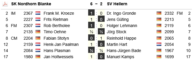Das entstandene Endspiel behandelte der IM dann gewohnt stark und geduldig und führte die Partie zu einem schönen Matt. Überhaupt muss man die Endspielleistungen der holländischen Nordhorner an den Spitzenbrettern anerkennend würdigen.