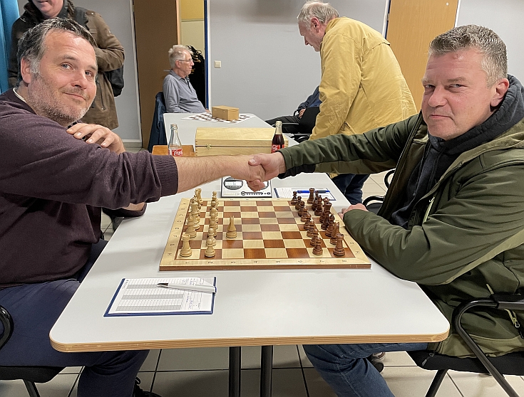 „Aufgrund der weiten Anfahrt von Holger (40 Minuten Fahrzeit) einigten sich beide auf eine Entscheidung durch 2 Blitzpartien (nicht Schnellschachmodus). Beide gewann Holger. In der 2. Blitzpartie hatte er deutlich weniger Restzeit übrig; das Matt konnte Stephan aber nicht mehr abwenden und gab zu Recht auf“ (Nobert Sobotta)