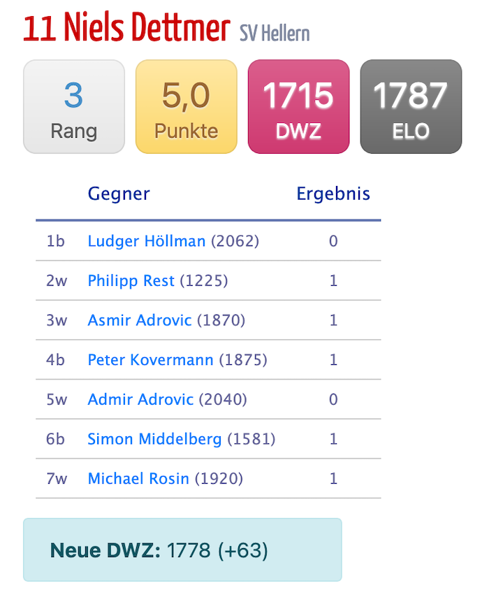 Am Ende gewann Admir Adrovic (DWZ 2040) souverän mit 7 P – also 100%. Zweiter wurde Ludger Höllmann (DWZ 2062) mt 5 P – punktgleich mit dem an 11 gesetzten Niels Dettmer (DWZ 1715), den nur die Feinwertung vom 2. Platz fernhielt. Eine bärenstarke Leistung. Aber was war passiert? Zunächst ein Knock-out, denn Niels verlor zum Auftakt gegen Höllmann. Offenbar schmeckte ihm das nicht. Niels gewann danach drei Partien, u.a. gegen Peter Kovermann in Runde 4. Bereits die Zwischentabelle kündigte also einiges an.