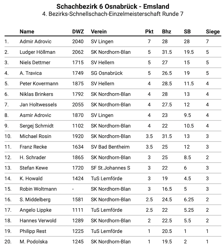 Die Start-Rangliste hatte diesmal nur wenig mit der Schlusstabelle zu tun. Vor Turnierbeginn waren Ludger Höllmann (NOH-Blanke), Jan Holtwessels (NOH-Blanke), Admir Adrovic (SV Lingen) und Michael Rosin (NOH Blanke) sowie Peter Kovermann die DWZ-Favoriten. Nur Peter lieferte aus Helleraner Sicht: er wurde wie angekündigt Fünfter.