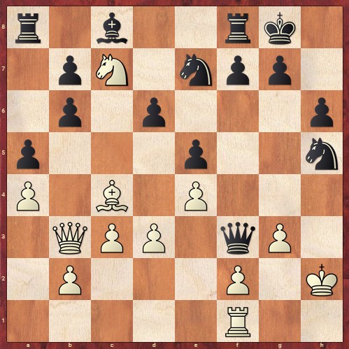 Hier nahm Peter den vergifteten Turm. Den nicht zu schlagen, sieht ebenfalls schlimm aus. Also 1. Sxa8 Lc8-h3! Schönes Opfer. Es drohte Dg2 matt. Turm f1-g1 hätte nicht geholfen. So folgte 2. Kxh3 Sh4+! nebst Matt. Es stand schnell also 2:0 für die Hausherren. Dadurch waren die Heimspieler fokussiert auf Unentschieden. Und genauso kam es auch. An Brett 8 versuchte Andre Böhme sein