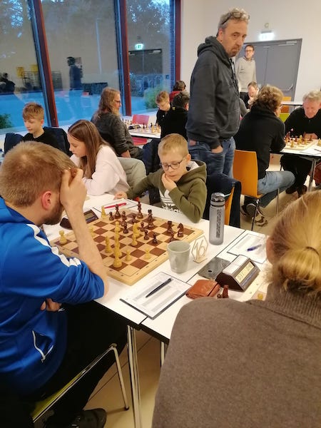 „Locke“ fand sich dagegen in einem Nachbarschaftsduell wieder. Sein Gegner hieß Ole Weitekamp – und der spielt beim Hagener SV 2, hat aber bereits zwei Einsätze in der Landesliga Nord mit 100% absolviert. Im Juni 2023 gewann Ole bei unserem Jubiläumsturnier den Ratingspreis <1400. Zwei Jahre später hat er über 500 Punkte mehr auf dem Konto.