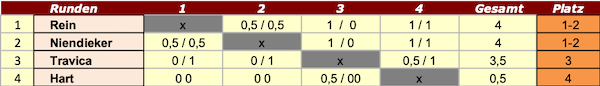 Martin Hart, Joachim Rein, Alexander Traviva und der Berichterstatter waren die 4 Spieler, die in einem doppelrundigen Turnier den Sieger im Dezember und den „Sieger-Gesamt“ ausspielten.