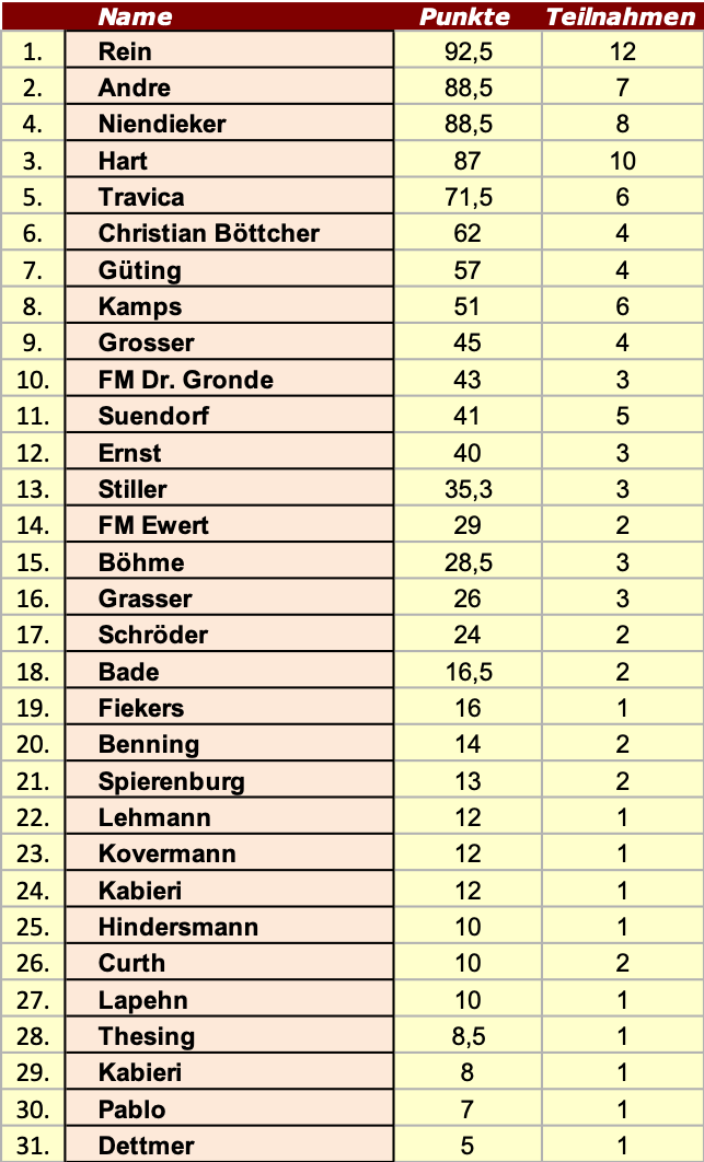 Die Rückrunde änderte am Gesamtergebnis nicht mehr viel. Aber Alexander spielte bärenstark und gewann alle drei Partien. Das reichte aber nur zum dritten Platz hinter den gemeinsamen Siegern Joachim Rein und Stephan Niendieker.
