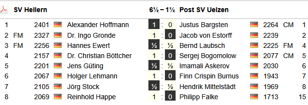 Für den Endstand sorgten dann Dr. Christian Böttcher (gegen Sergey Bogomolow) und Jens Güting (gegen Imamali Askerov) – keineswegs Ergebniskosmetik, sondern genau die Brettpunkte, die Hellern brauchte, um in der Tabelle Lehrte zu überholen und auf Platz 4 zu landen.