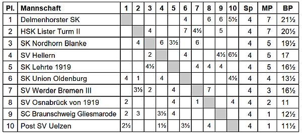 Fazit: ein spannender Sonntag, auch für die Konkurrenz. Der OSV hielt vorne und hinten gut mit, verlor aber an den Bretter 4-7 alle Partien, sodass Delmenhorst mit 7 Punkten und einem Brettpunkt mehr vor dem Lister Turm II die Tabelle anführt. NOH-Blanke landete auswärts einen Kantersieg gegen das keineswegs schlecht besetzte Team von Werder Bremen III.