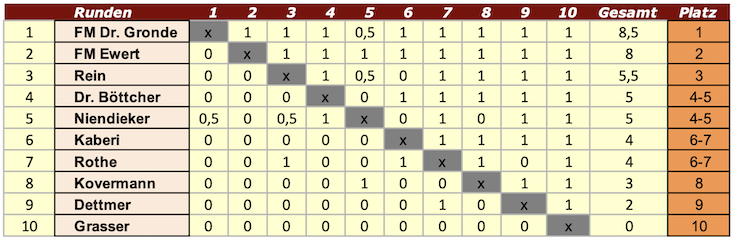 Den dritten Platz sicherte sich Joachim Rein mit starken 5,5 Punkten vor Christian Böttcher und mir mit jeweils 5 Punkten.
