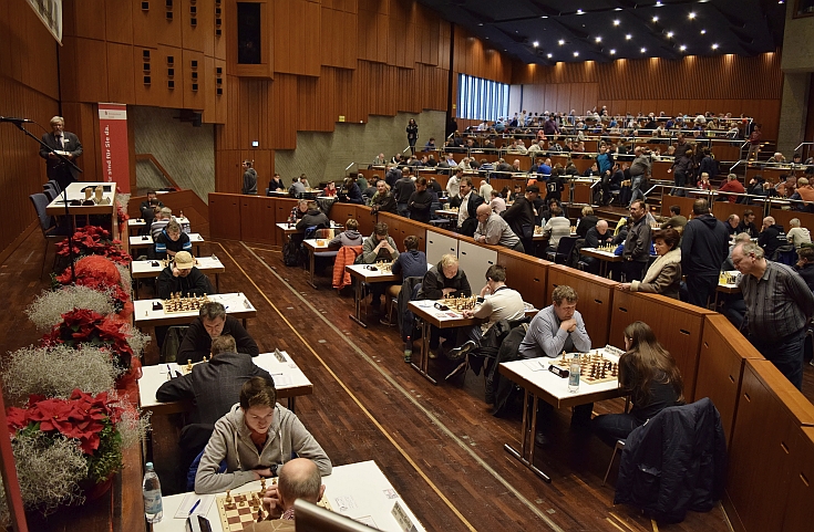 Perfekt für ein Schachturnier, als wäre er dafür gebaut worden, ist der Peter-Parler Saal im Congress-Centrum Stadtgarten. Die kaskadenartige Konstruktion liefert genug Platz und Beinfreiheit an jedem Brett sowie verschiedene Blickwinkel für Kiebitze ohne die Spieler zu stören. Auch die etwas abgegrenzten Bretter 1-10 des A-Open und das Spitzenbrett im B-Open sind für Zuschauer hervorragend einsehbar. Beim Herumflanieren durch den Saal und die Reihen ist manchmal fast störend, dass man selbst eine Partie zu spielen hat. Das Ganze wird durch eine perfekte Organisation, ein unauffälliges Schiedsrichterteam, einen großen Analysebereich, ein Catering und einen umfangreichen Schachbücherstand abgerundet.