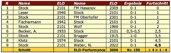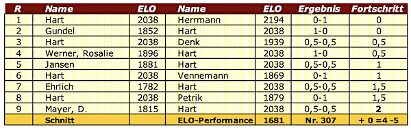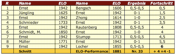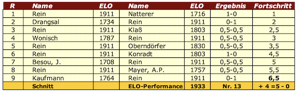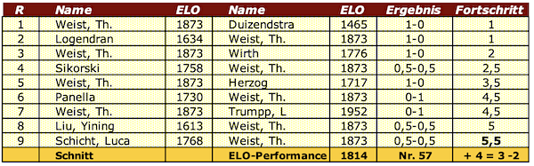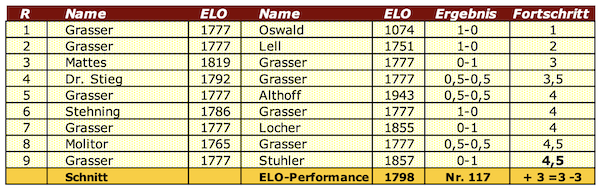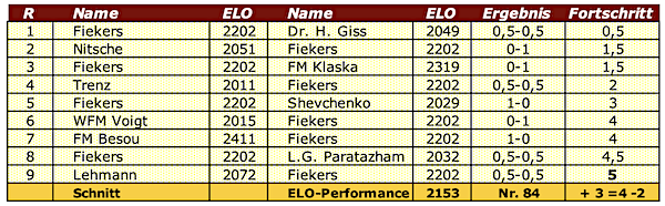 Unser ehemaliger Mitstreiter Christian Fiekers, der laut DWZ-Liste seit 2011 kein Turnier gespielt hat, lieferte eine tolle Performance. Lediglich 13 DWZ-Punkte blieben auf der Strecke. Nach so langer Pause ist das spektakulär!
