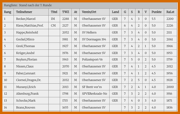 Reinhold war diesmal an 5 gesetzt. Topfavorit war IM Marcel Becker, der für den OSV in der NRW-Klasse 2 an Brett 1 spielt. Dass der Gastgeber ‚ganz oben‘ die Start-/Rangliste auch mit weiteren starken Spielern dominierte, war keine Überraschung.