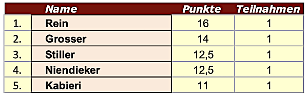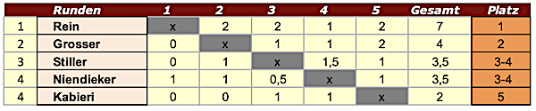 Die anderen Teilnehmer nahmen sich dazu gegenseitig die Punkte und der Berichterstatter holte erst in der vierten Runde seinen ersten halben Punkt.