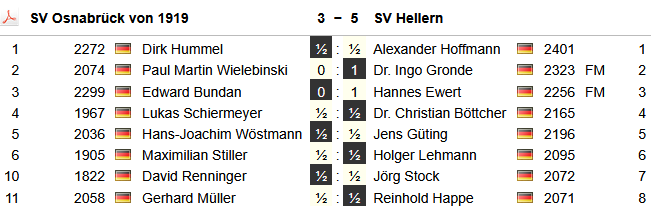 Der Kampf war entschieden, aber an Brett 1 tobte noch das Gigantenduell zweier alter Bekannter. Alexander Hoffmann und Ex-Helleraner Dirk Hummel waren lange Zeit Mannschaftskameraden in der Hochzeit des Schachvereins Melle. Und entgegen mancher Prognosen über eine friedliche Partie entwickelte sich eine faszinierende facettenreiche Partie.