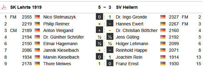 Achsenbruch und weit und breit kein Servicemechaniker in Sicht! So müssen sich die fünf Helleraner gefühlt haben, als sie die Reise nach Lehrte antraten. Nur drei gehörten zum Stamm der Ersten. Und beinahe hätte das Rumpfteam etwas geholt. Aber auch die 3-5-Niederlage fühlte sich wie ein Sieg an. Zwei Partien konnte man sogar als grandios bezeichnen. Und das Mini-Match der Anwesenden gewann Hellern. Die Redaktion gratuliert!
