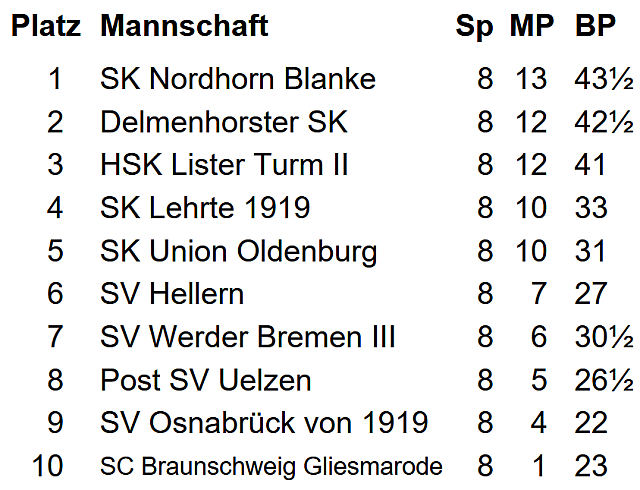 Hellern 1 hat einen Platz in der oberen Tabellenhälfte endgültig verpasst. Am 12. April kann gegen Bremen III kann Platz 6 verteidigt werden. Höhepunkt der letzten Runde ist das Treffen der Giganten Delmenhorst gegen NOH-Blanke! Verfolger Lister Turm II ist bei einem knappen Sieg der Delmenhorsters zumindest rechnerisch nicht aus dem Rennen