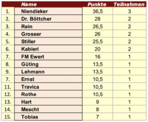 In Abwesenheit von Joachim Rein übernahm damit der Berichterstatter die Gesamtführung vor Christian Böttcher. Aber dies ist nur ein Zwischenstand nach einem Drittel aller Turniere.