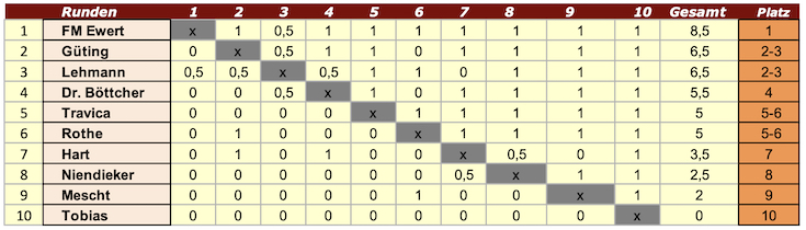 Vierter wurde Christian mit 5,5 Punkten vor Alexander Travica und Martin Rothe mit jeweils 5 Punkten. Beide wiesen die höher gerateten Locke und Stephan Niendieker deutlich in die Schranken.
